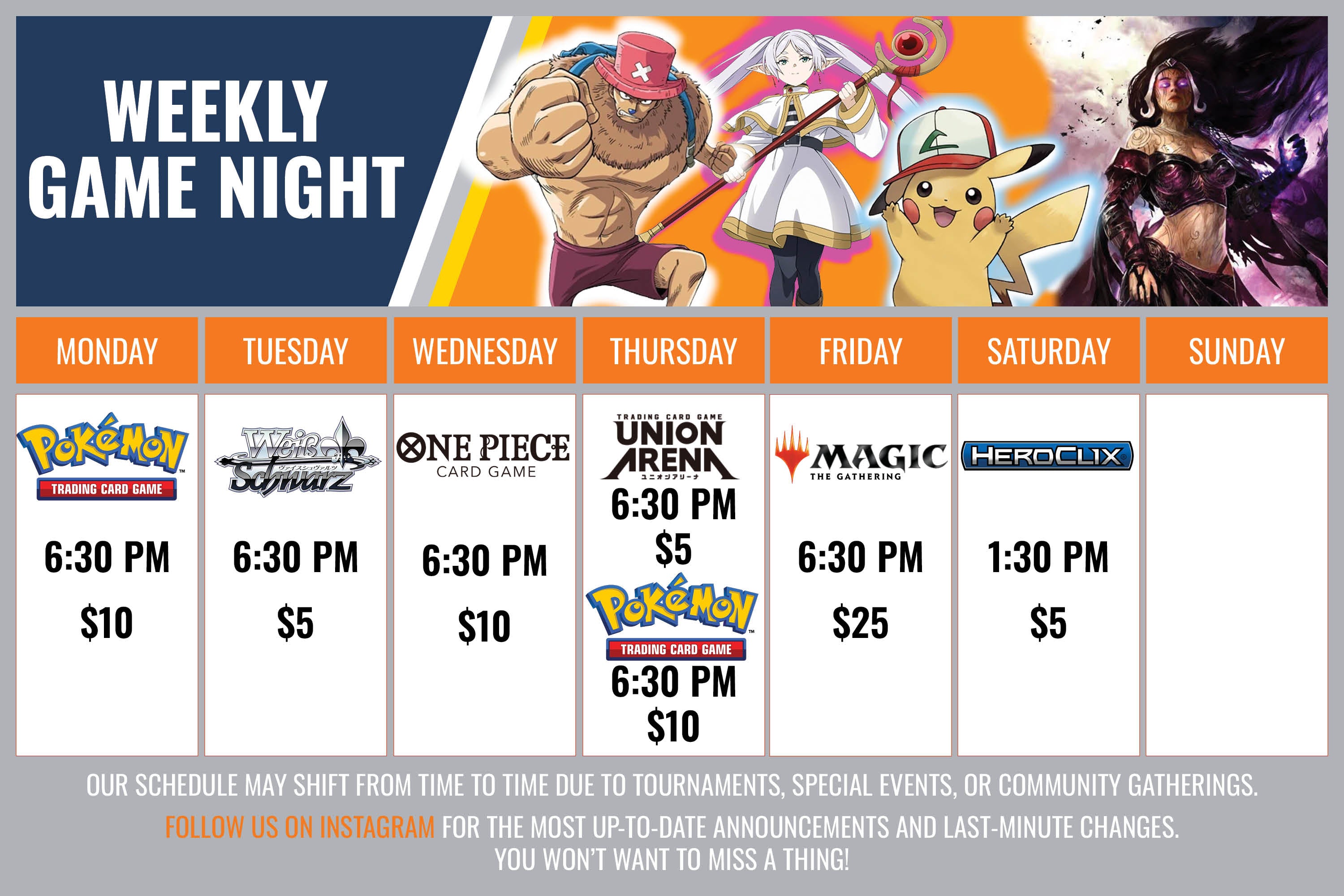 Join us every week for exciting game nights filled with fun, friendly competition, and just to hang out! Whether you're into trading card games, tabletop RPGs, or classic board games, there's always something happening at Game time.